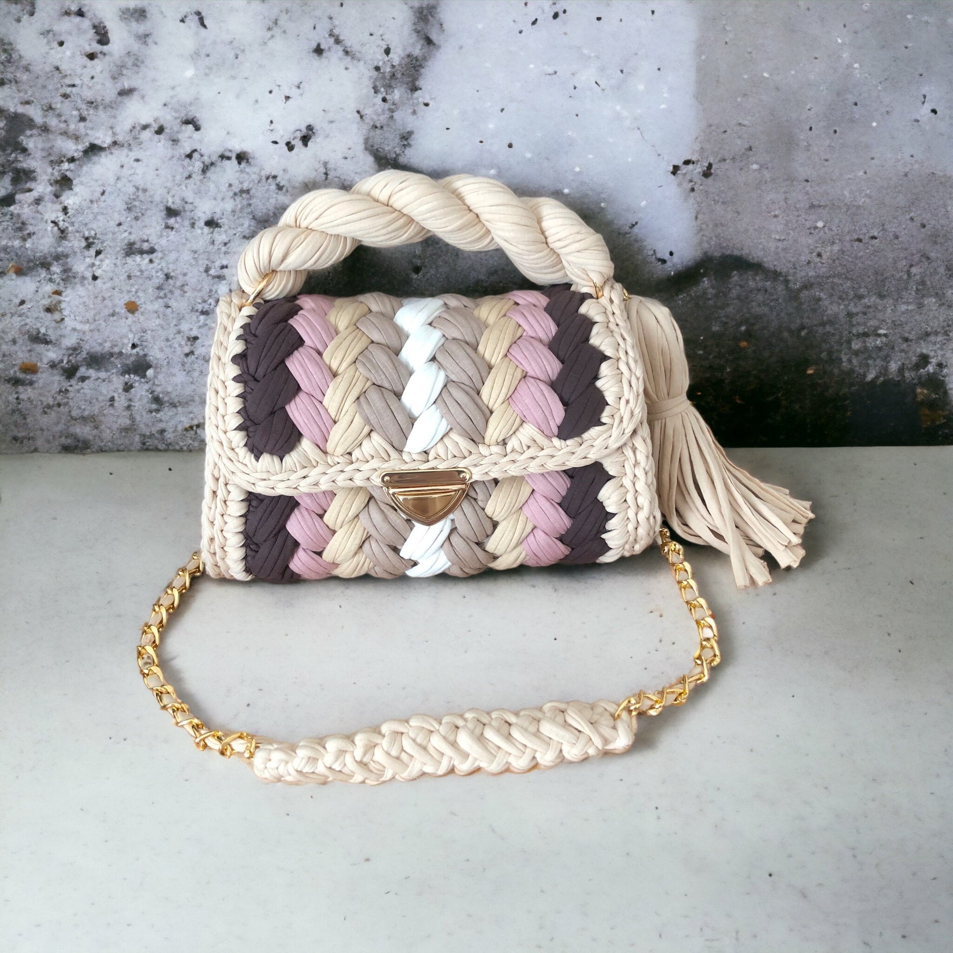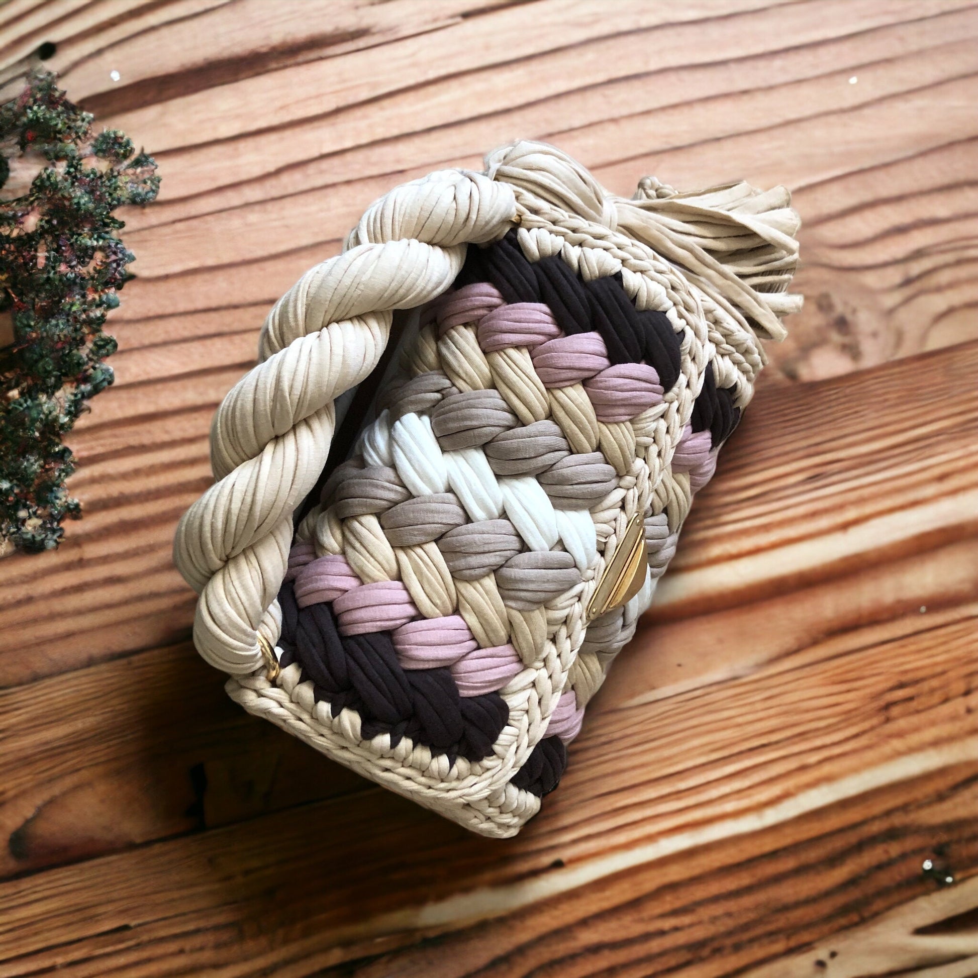 Soft beige, blush, mocha, chocolate, and crisp white tones in a chevron weave