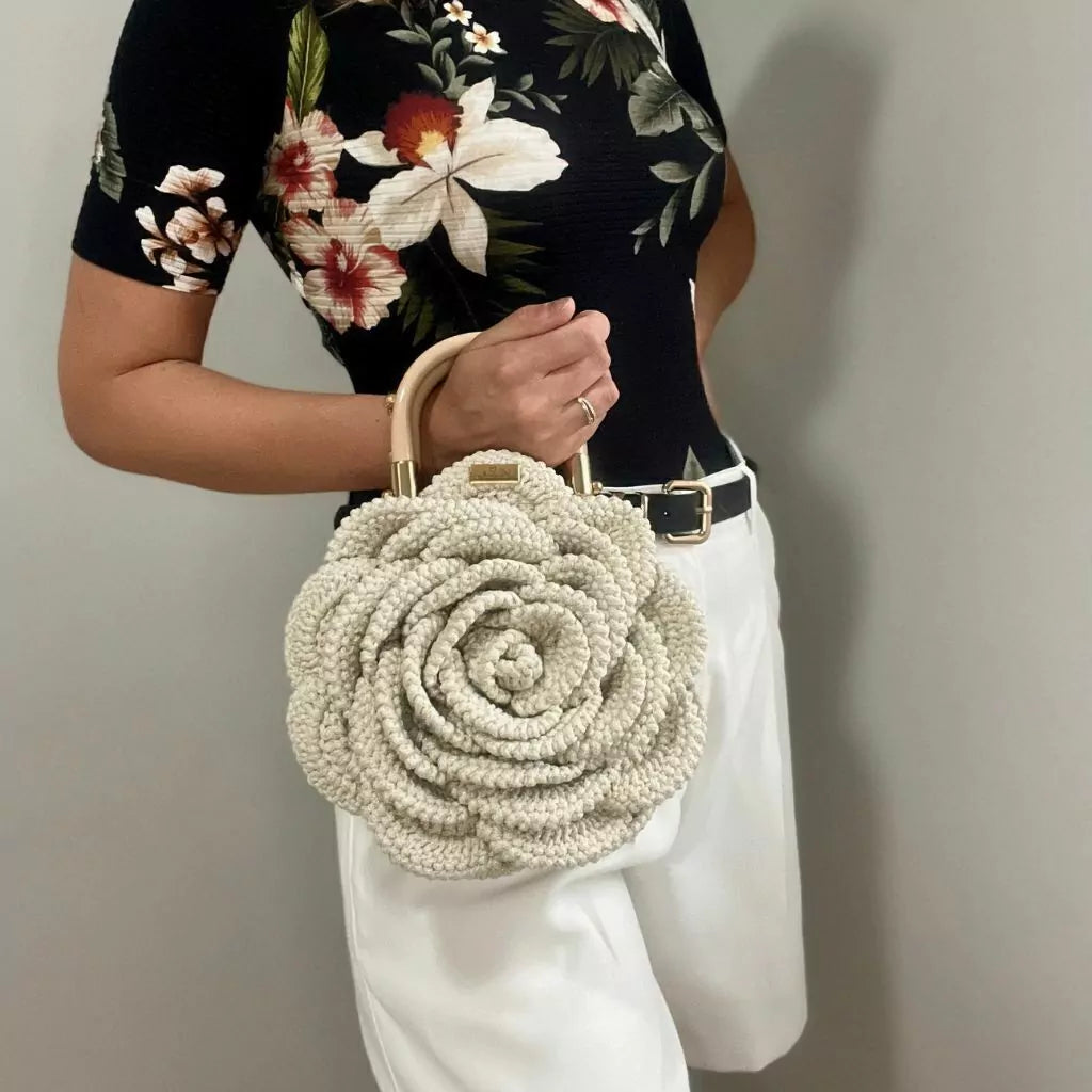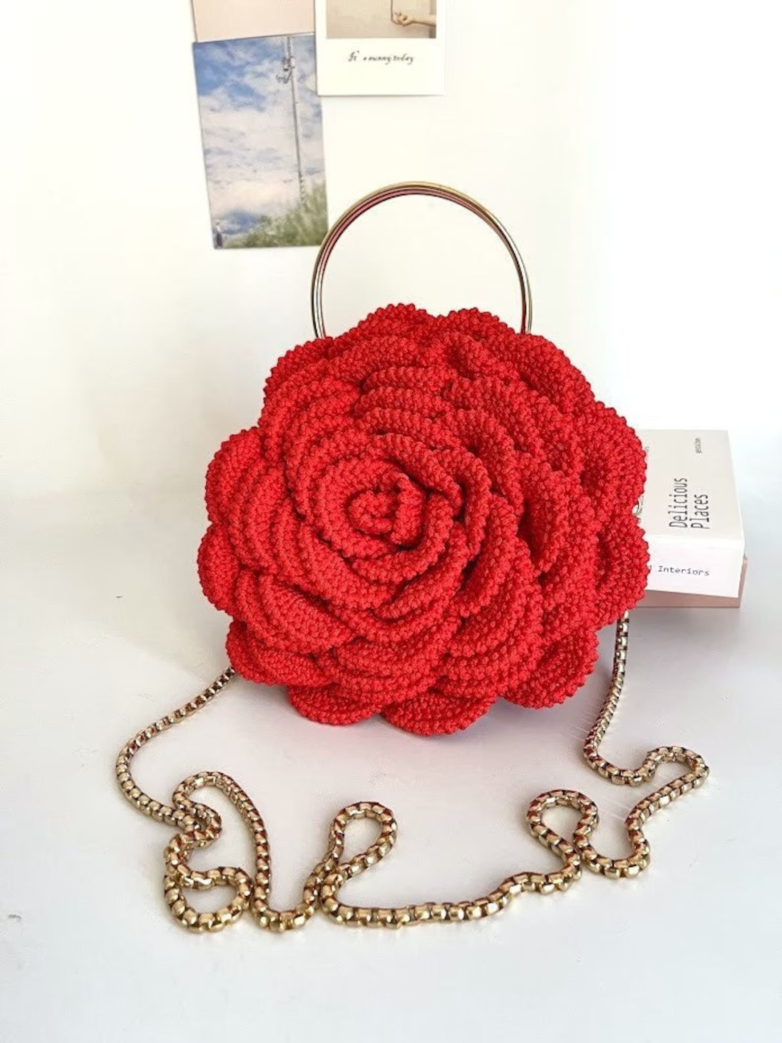 Features a beautifully crafted rose-shaped design made from crocheted material.